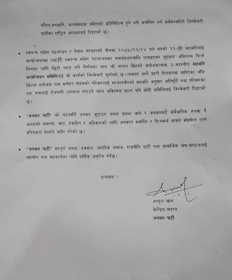 काठमाडौं,चैत्र ४ सरकारसँग ११ बुँदे सम्झौता गरेर पृथकतावादी आन्दोलन छाडेको सीके राउत नेतृत्वको स्ववतन्त्र मधेस गठबन्धनले नयाँ दल दर्ता गर्ने निर्णय गरेको छ । लाहानमा आइतबार र सोमबार दुई दिन बसेको राष्ट्रिय परिषद्को बैठक (केन्द्रीय भेला)ले संविधानअनुसार ‘जनमत पार्टी’ नाम राखेर दल खोल्ने निर्णय गरेको हो । भेलाले दल दर्ताका लागि राउतको नेतृत्वम...