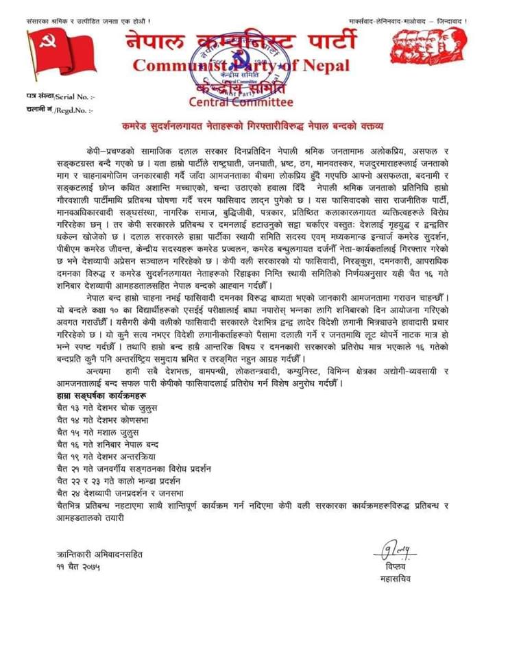 काठमाडौं चैत १२, प्रतिबन्धित अवस्थामा रहेको नेत्रविक्रम चन्द विप्लव नेतृत्वको समूहले सरकारले चैत महिना भित्र फुकुवा नगरे आमहडताल गर्ने घोषणा गरेको छ । सोमबार बेलुका पार्टीका महासचिव नेत्रविक्रम चन्द विप्लवले विज्ञप्ति जारी गर्दै यस्तो बताएका हुन् । तर त्यसअघि सोमबार नै बसेको सत्तारुढ नेपाल कम्युनिष्ट पार्टी (नेकपा) को संसदीय दलको बैठकमा ...