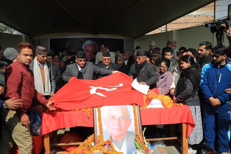 काठमाडौँ फागुन २३, नेपाल कम्युनिष्ट पार्टी (नेकपा)का अध्यक्ष पुष्पकमल दाहाल ‘प्रचण्ड’ले नेपालको कम्युनिष्ट आन्दोलनमा लामो समय बिताउनुभएका दिवङ्गत वामपन्थी नेता तथा पूर्वसांसद गणेश पण्डितको पार्थिव शरीरमा पुष्पहार चढाइ श्रद्धाञ्जलि अर्पण गर्नुभएको छ । नेकपाको केन्द्रीय कार्यालय धुम्बाराहीमा आज अध्यक्ष दाहालले उहाँको पार्थिव शरीरमा पार्टीको झण...