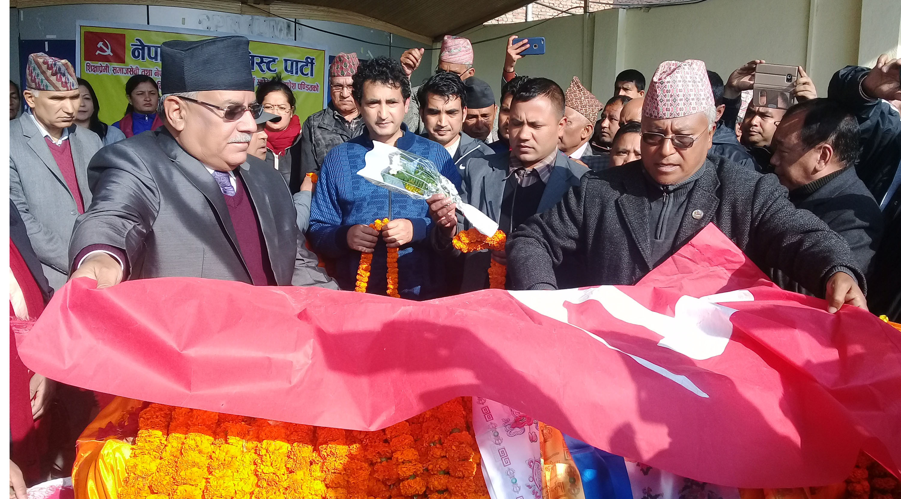 काठमाडौं फागुन१९, प्रधानमन्त्री एवं नेकपाका अध्यक्ष केपी शर्मा ओली र अर्का अध्यक्ष पुष्पकमल दाहालले भरतमोहन अधिकारीको पार्थिव शरीरमा पार्टीको झण्डा ओढाएर श्रद्धाञ्जली अर्पण गरेका छन्। नेकपाको पार्टी कार्यालय धुम्बाराहीमा भैरहेको श्रद्धाञ्जली कार्यक्रममा उनीहरुले पार्टीको झण्डा ओढाएर श्रद्धाञ्जली अर्पण गरेका हुन्। अधिकारीप्रति श्रद्धाञ्जली ...