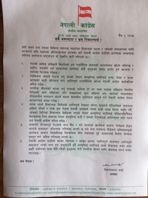 काठमाडौं चैत्र २ प्रमुख प्रतिपक्षी दल नेपाली कांग्रेसले हिंसात्मक विद्रोहमा गएको नेत्रविक्रम चन्द नेतृत्वको नेपाल कम्युनिष्ट पार्टी नेकपालाई विश्वासमा लिन सरकारलाई अपील गरेको छ । प्रवक्ता विश्वप्रकाश शर्माले शनिबार विज्ञप्ति जारी गर्दै नेकपालाई संविधानभित्रैबाट विश्वासमा लिन सत्तारुढ नेकपा र नेतृत्वलाई आवेगमुक्त भएर पहल गर्न अपिल गरेका हुन्...