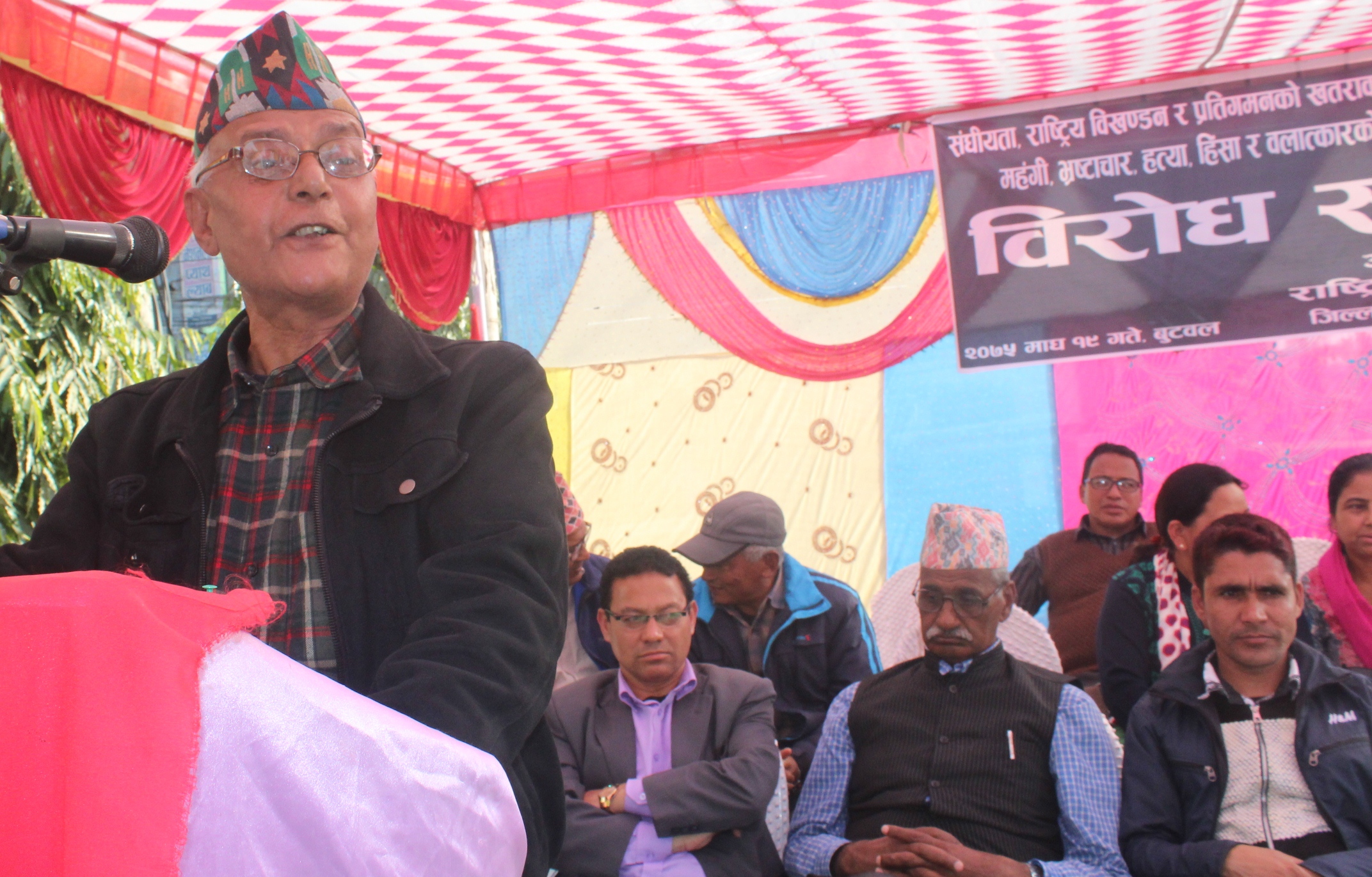 बुटवल, माघ १९। राष्ट्रिय जनमोर्चाले शनिबार देशभर बिरोधसभाहरु गरेको छ । संघीयताको खारेजी, महङी, भ्रष्टाचार, हत्या हिंसाको बिरोधमा राष्ट्रिय जनमोर्चाले बिरोध सभाहरु गरेको हो । पार्टीको केन्द्रिय कार्यक्रम अनुसार रुपन्देहीको बुटवलमा सो पार्टीले बिरोध सभा गरेको छ । उक्त सभामा बोल्दै राष्ट्रिय जनमोर्चाका नेता भैरवराज रेग्मीले संविधानका उ...