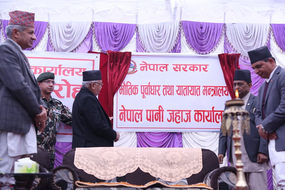 काठमाडौं फागुन २, प्रधानमन्त्री केपी शर्मा ओलीले नेपाल पानीजहाज कार्यालयको उद्घाटन गरेका छन् । बिहीबार बिहान आयोजित एक समारोहका बीच प्रधानमन्त्री ओलीले एकान्तकुनामा स्थापना गरिएको कार्यालय उद्घाटन गरेका हुन् ।एकान्तकुना स्थित चक्रपथ सुधार आयोजनाको कार्यालयलाई पानीजहाज कार्यालय बनाइएको छ । भौतिक पूर्वाधार मन्त्रालय अन्तर्गत स्थापना भएको प...
