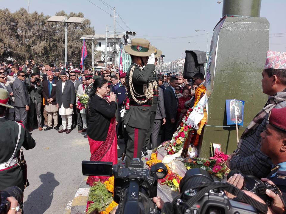 काठमाडौं पुस २७, राष्ट्रपति विद्या भण्डारीले सिंहदरबारको मूलगेट अगाडि रहेको राष्ट्र निर्माता पृथ्वीनारायण शाहको शालिकमा माल्यार्पण गर्नु भएको छ । राष्ट्रपति भण्डारीले २ सय ९७ औं पृथ्वी जयन्ति तथा राष्ट्रिय एकता दिवसको अवसर पारेर शुक्रबार सिंहदरबारको मूलगेटमा आयोजित एक समारोहमा त्यहाँ रहेको राष्ट्र निर्माता पृथ्वीनारायण शाहको शालिकमा माल्यार...