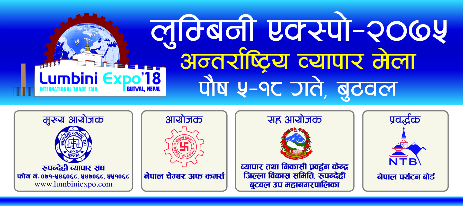 बुटवल, कार्तिक । बुटवलमा आगामी पुष ५ देखि १८ गतेसम्म सञ्चालन हुने ‘लुम्बिनी एक्स्पो-२०७५, अन्तर्राष्ट्रिय व्यापार मेला’को तयारी शुरु भएको छ । रुपन्देही व्यापार संघ र नेपाल चेम्बर अफ कमर्स काठमाडौंको मुख्य आयोजना तथा तिलोत्तमा व्यापार संघ, देवदह व्यापार संघ र सैनामैना व्यापार संघको सह-आयोजनामा सञ्चालन हुने मेलाको तयारी शुरु भएको हो ।...