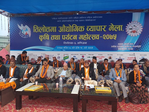 तिलोत्तमा, १८ मंसिर । राष्ट्रिय स्वाधीनताको लागि राष्ट्रिय अर्थतन्त्र, राष्ट्रिय अर्थतन्त्रको लागि राष्ट्रिय औद्योगीकरण तथा व्यापार बिबिधिकरण भन्ने मूल नाराका साथ रुपन्देहीको तिलोत्तमा नगरपालिकामा संचालित तिलोत्तमा औद्योगिक व्यापार मेला कृषि तथा पर्यटन महोत्सव–२०७५ को समापन भएको छ । उद्योग व्यापार संगठन रुपन्देहीको तिलोत्तमा शाखाको मुख्य आयोज...