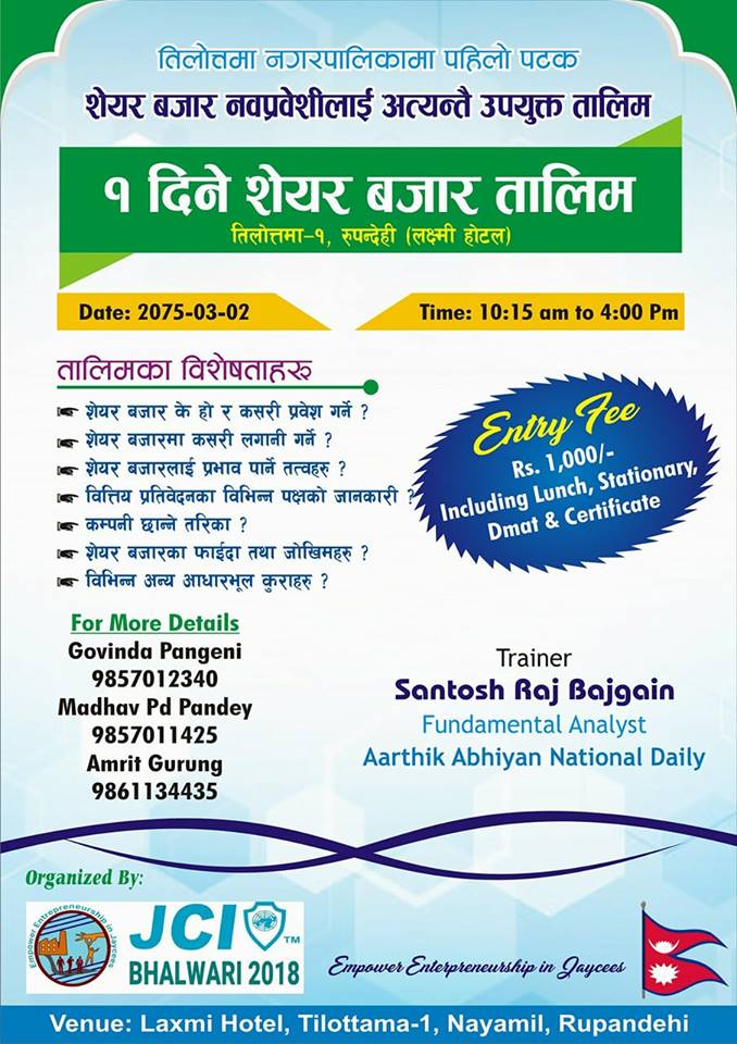 बुटवल । रुपन्देहीको तिलोत्तमा नगरपालिकामा पहिलो पटक एक दिने वृहत शेयर वजार तलिम हुने भएको छ ।भलवारी जेसिजको आयोजनामा आउदो असार २ गते नयाँमिलमा एक दिने तालिमको आयोजना गरिएको कार्यक्रम संयोजक माधव प्रसाद पाण्डेले जानाकारी दिनुभयो । पछिल्लो समय शेयर बजारको बारेमा वढ्दै गएको चासो र भलवारी जेसिजले लिएको उद्यमशीलताको नारालाई सार्थक तुल्याउन तालिमक...
