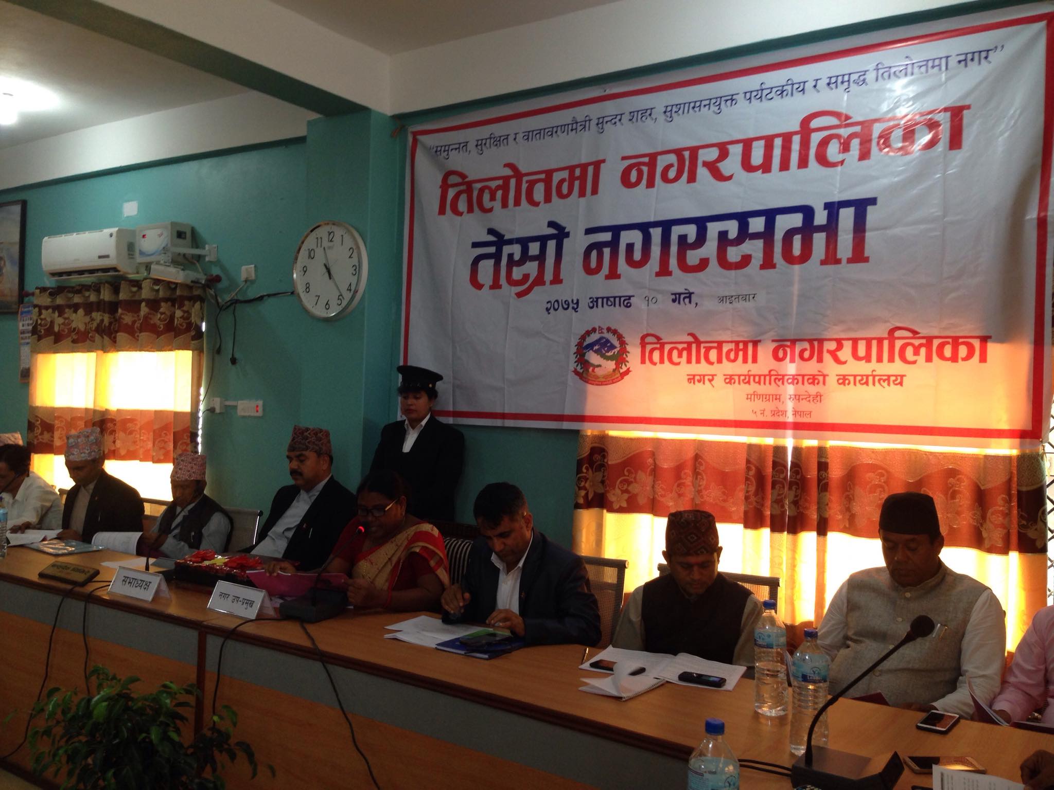 तिलोत्तमा, असार १० । रुपन्देहीको तिलोत्तमा नगरपालिकाले आर्थिक वर्ष २०७५÷७६ का लागि एक अर्ब ३५ करोड रुपैंयाँको बजेट प्रस्तुत गरेको छ । तेस्रो नगरसभाको आइतबारको बैठकमा नगर उप–प्रमुख एवं बजेट तथा कार्यक्रम तर्जुमा समिति संयोजक जागेश्वरी चौधरीले एक अर्ब ३५ करोड ३२ लाख ५१ हजार रुपैंयाँको बजेट प्रस्तुत गर्नुभएको हो । प्रस्तुत बजेट पारित भएको छ । आ...