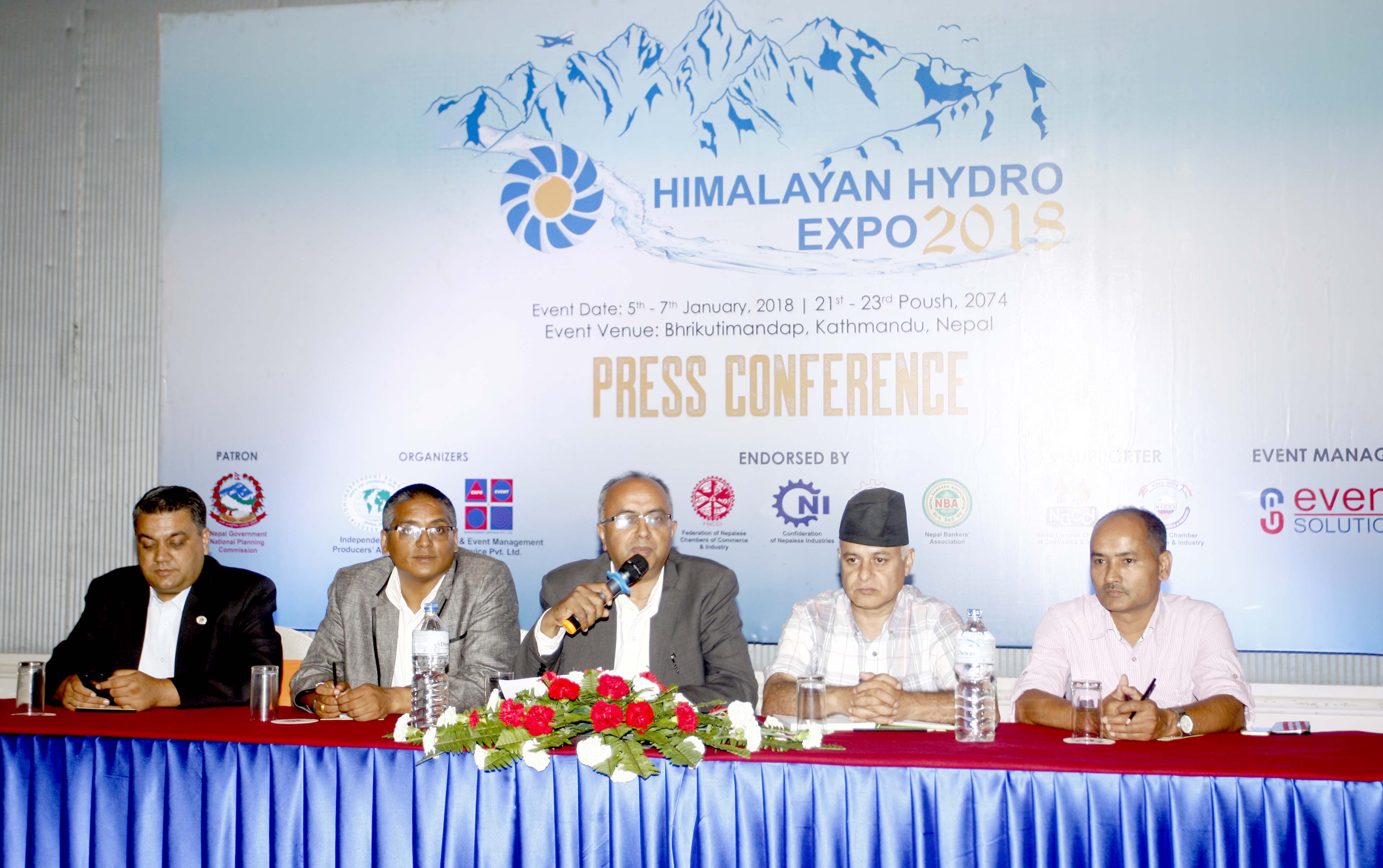 काठमाडौँ, ११ पुस - जलविद्युत् क्षेत्रमा लगानी, उत्पादन तथा प्रविधिका बारेमा जानकारी दिने उद्देश्यले स्वतन्त्र ऊर्जा उत्पादकको संस्था(इपान)ले यही पुस २१ गतेदेखि २३ गतेसम्म ‘हिमालयन हाइड्रो एक्स्पो २०१८’ को आयोजना गर्ने भएको छ । जलविद्युत्को विकास र विस्तारमा सहयोग पुग्ने गरी उक्त प्रदर्शनीको आयोजना गर्न लागिएको यहाँ आज आयोजित पत्रकार सम्मेलनम...