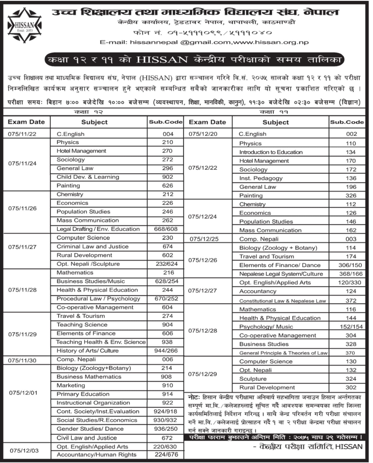 उच्च शिक्षालय तथा माध्यमिक बिद्यालय संघ (हिसान)ले संचालन गर्ने २०७५ सालको कक्षा ११ र १२ को परीक्षा तालिका सार्बजनिक भएको छ । बिस्तृत समयतालिका तल दिइएको छ ।माघ ६ २०७५ ekhabarnepal