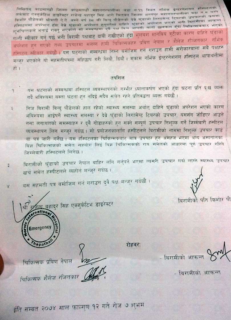 काठमाडौं,फागुन १२ । नर्भिक अन्तराष्ट्रिय अस्पतालले उपचारका क्रममा गम्भीर गल्ती गरेको भेटिएको छ । अस्पतालका डाक्टरले देब्रो खुट्टा अपरेशन गर्न भर्ना भएकी विन्दु पौडेलको दाहिने खुट्टाको घुँडाको अपरेशन गरेको हो । चितवनकी ३८ वर्षीया पौडेल लिगामेन्ट च्यातिएका कारण उपचार गर्न नर्भिक आएकी थिइन् । चितवनमा देखाउँदा अपरेशन गर्नुपर्छ भनेरपछि परिव...