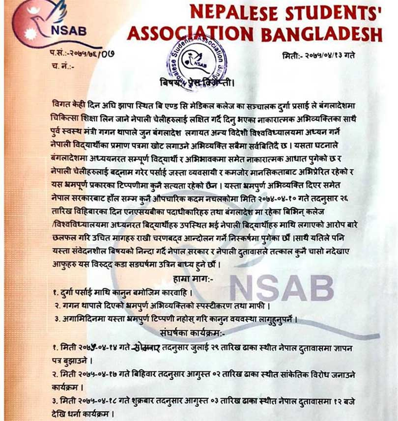काठमाडौं, साउन १४ नेपाल स्टुडेन्ट युनियन, बंगलादेशले बी एण्ड सी मेडिकल कलेजका सञ्चालक दुर्गा प्रसाई र पूर्वस्वास्थ्यमन्त्री गगन थापाको अभिव्यक्तिप्रति आपत्ति जनाएको छ । उसले प्रसाईमाथि कानूनी कारबाही गर्न माग गरेको छ भने नेपाली कांग्रेसका नेता थापाले भने माफी माग्नु पर्ने बताएकोे छ । प्रसाईलाई कारवाही नभए र थापाले माफी नमागेसम्म ढाकास्थित...
