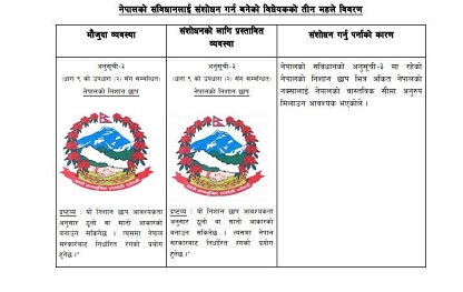 काठमाडौं ,जेठ ३१ नयाँ नक्सा खारेज गर्न समाजवादी पार्टीकी सांसद सरिता गिरीको प्रस्तावलाई छलफलमा नलगी सरकारको संशोधन विधेयक संसदबाट पारित गर्ने तयारी भएको छ। भारतले अतिक्रमण गरेका लिम्पियाधुरा, लिपुलेक र कालापानीसहितको नयाँ नक्साअनुसार संविधानको अनुसूची संशोधन गर्न सरकारले पेश गरेको संशोधन विधेयक खारेज गर्न सांसद गिरीले संशोधन दर्ता गरेकी थिइ...