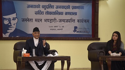 रासस काठमाडौँ, असार १४ गते । प्रधानमन्त्री केपी शर्मा ओलीले आफ्नो अतिक्रमित भूमि समेटेर नक्शा छापे वापत मुलुकको सरकार परिवर्तन हुने विगतको जस्तो कमजोर राष्ट्रियताको स्थिति अहिले नरहेको स्पष्ट गर्नुभएको छ । जननेता मदनकुमार भण्डारीको ६९ औँ जन्मजयन्तीका अवसरमा मदन भण्डारी फाउण्डेशनले आज आयोजना गरेको ‘जनताको बहुदलीय जनवाद (जबज)को प्रकाशमा सङ्घीय ल...