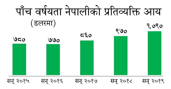 काठमाडौं, असार १९ नेपाल न्यून आय भएको मुलुकबाट इतिहासमै पहिलोपटक निम्नमध्यम आय भएको मुलुकमा उक्लिएको छ । विश्वबैंकले विहीवार सार्वजनिक गरेको तथ्यांक अनुसार नेपाल सन् २०१९ मा निम्नमध्यम आय वर्गको मुलुकमा स्तरोन्नति भएको हो । सन् २०१९ मा १०३६ देखि ४ हजार ४५ अमेरिकी डलरसम्म प्रतिव्यक्ति आम्दानी (प्रतिव्यक्ति कुल राष्ट्रिय आय) भएका मुलुकहरू न्य...