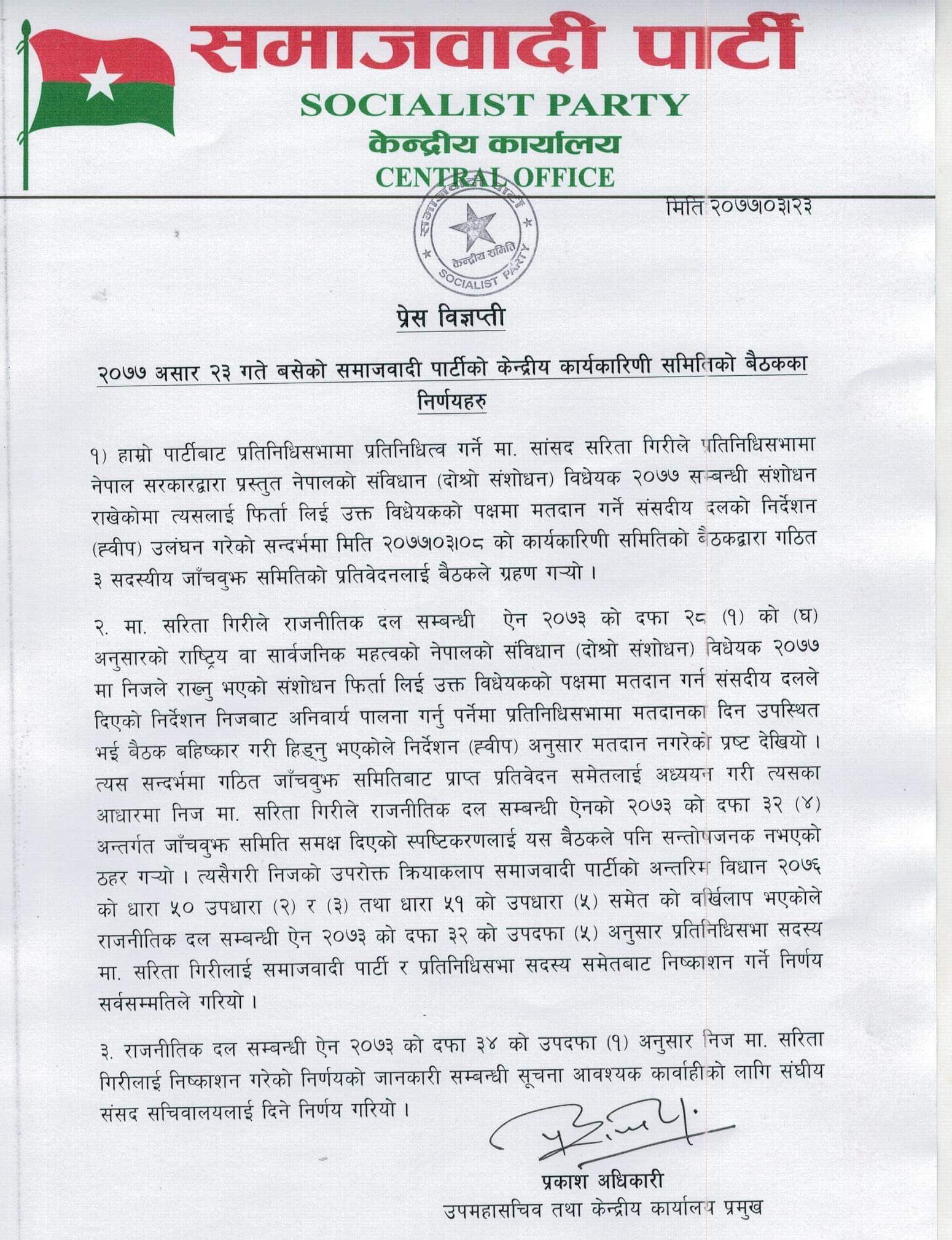 काठमाडौं, असार २३ संघीय समाजवादी पार्टीले सांसद सरिता गिरीलाई पार्टीको साधारण सदस्यसमेत नरहने गरी सांसद पदबाट हटाउने निर्णय गरेको छ। ‘नेपालको संविधान दोस्रो संशोधन विधेयकको सम्बन्धमा सरिता गिरीको अभिव्यक्तिबारे समाजवादी पार्टीको सो निर्णय संसदलाई जानकारी दिइने’ सो पार्टीका केन्द्रीय सदस्य विश्वदीप पाण्डेले जनाएका छन्। पार्टी ह्वीपको उ...